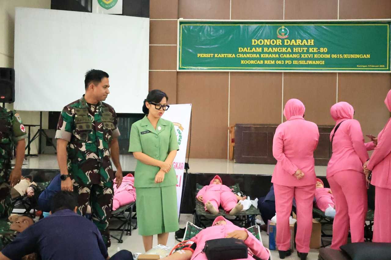Kuningan,-Kodim 0615/Kuningan menyelenggarakan kegiatan Donor Darah Serentak dalam rangka memperingati Hari Ulang Tahun (HUT) ke-80 Persit Kartika Chandra Kirana (KCK) Tahun Anggaran 2026. di Aula Kodim 0615/Kuningan, Senin 9 Februari 2026.